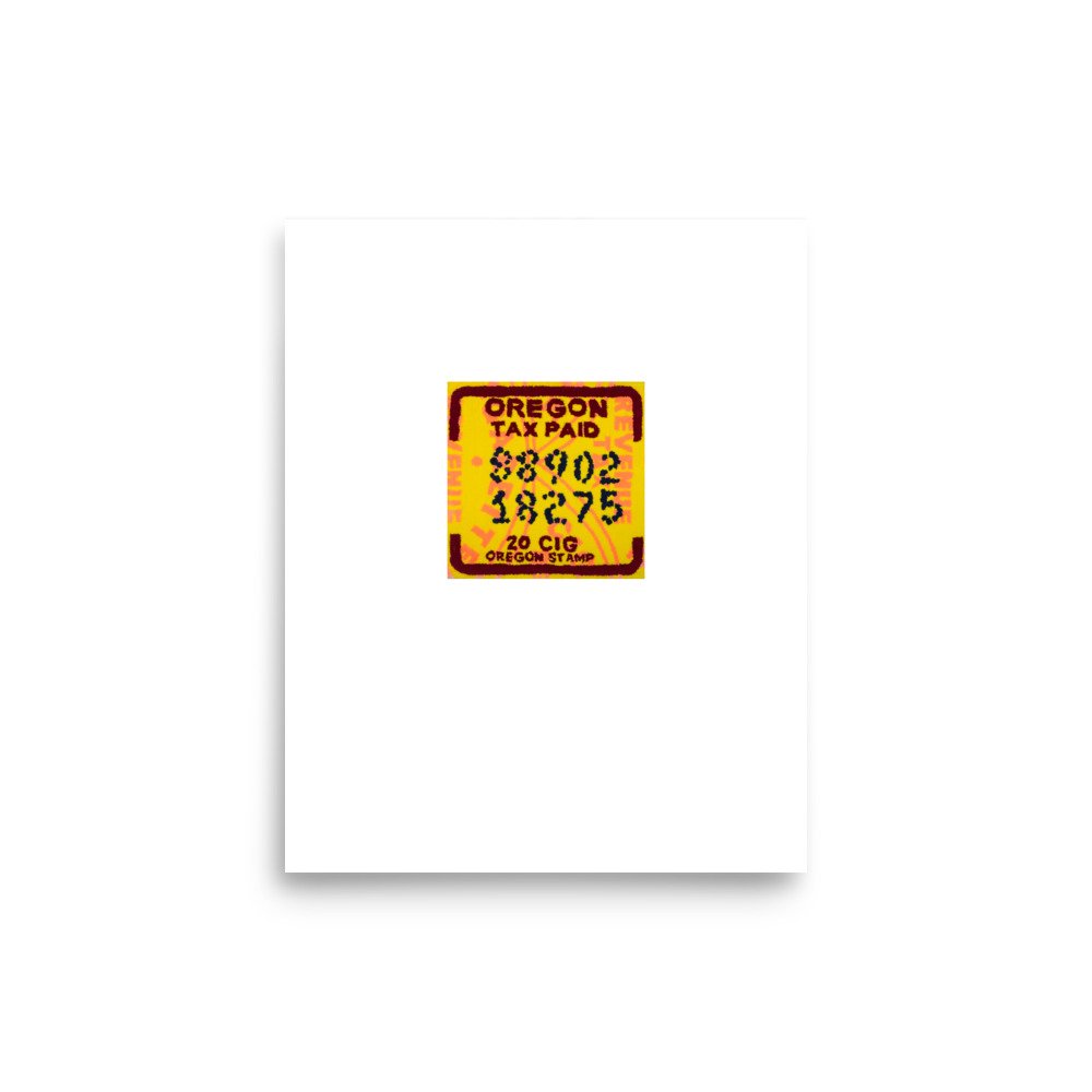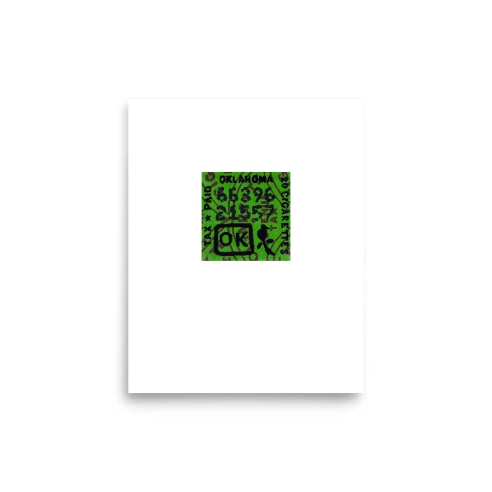 Print of the "California (tobacco) tax tufting" rug, part of a collection of 48 hand-tufted rugs based on the tobacco tax stamps from the United States. This project emerged while processing both personal and collective grief. The work prompts questions of how addiction is woven into the fabric of American culture and history.