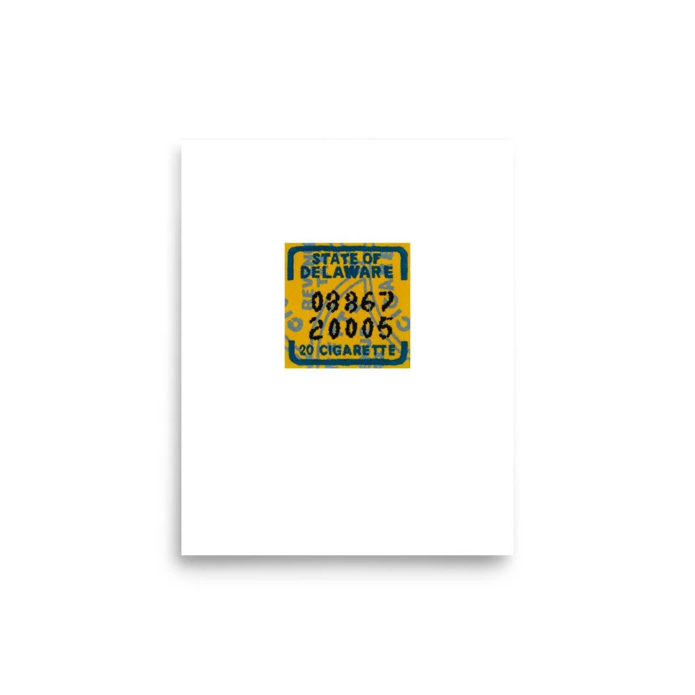 Print of the "Delaware (tobacco) tax tufting" rug, part of a collection of 48 hand-tufted rugs based on the tobacco tax stamps from the United States. This project emerged while processing both personal and collective grief. The work prompts questions of how addiction is woven into the fabric of American culture and history.