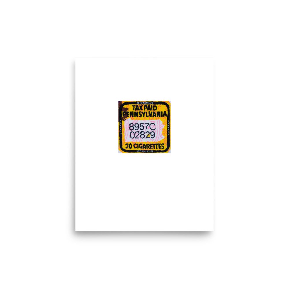 Print of the "Pennsylvania (tobacco) tax tufting" rug, part of a collection of 48 hand-tufted rugs based on the tobacco tax stamps from the United States. This project emerged while processing both personal and collective grief. The work prompts questions of how addiction is woven into the fabric of American culture and history.