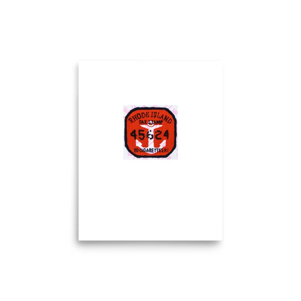 Print of the "Rhode Island (tobacco) tax tufting" rug, part of a collection of 48 hand-tufted rugs based on the tobacco tax stamps from the United States. This project emerged while processing both personal and collective grief. The work prompts questions of how addiction is woven into the fabric of American culture and history.